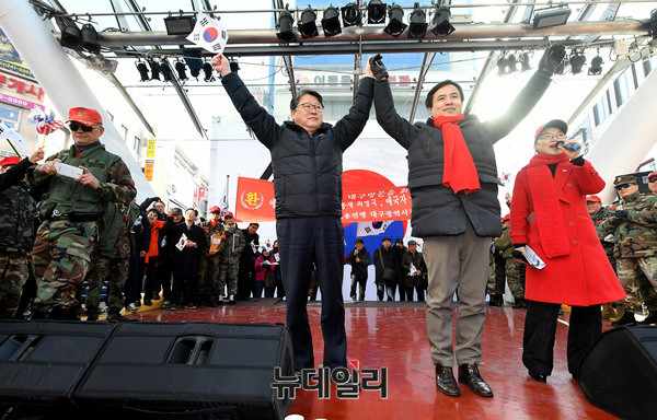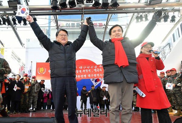 김진태(오른쪽), 조원진 의원이 26일 오후 대구 동성로 대구백화점 앞에서 열린 대구 태극기집회에 참석해 발언에 앞서 손을 잡고 인사하고 있다. 이날 대구 태극기집회에는 권영해 탄기국 공동대표, 정광용 대변인, 김진태 새누리당 의원, 정미홍 전 KBS아나운서, 박성현 뉴데일리주필 등이 연사로 나섰다. 행사가 끝난 뒤에는 대형 태극기를 펼쳐들고, 태극기를 흔들며 가두행진을 이어갔다. (대구=뉴데일리 정상윤 기자)