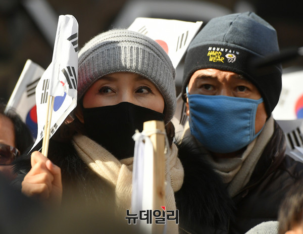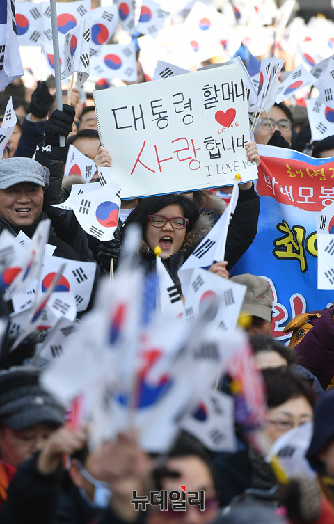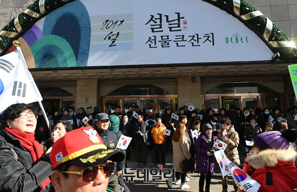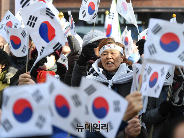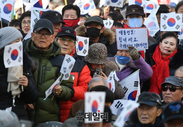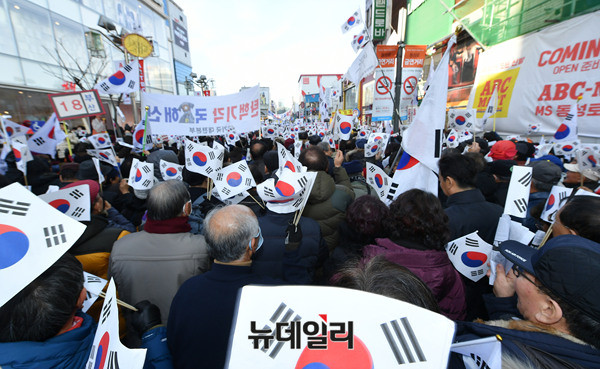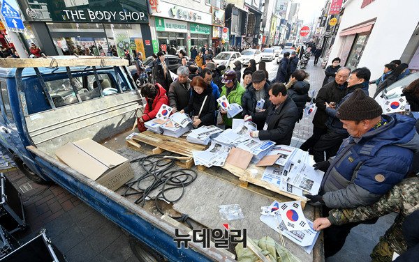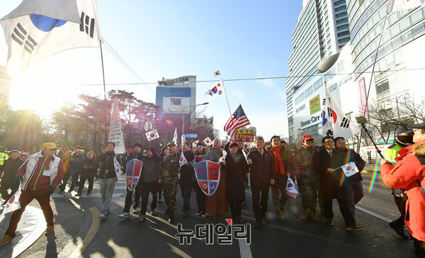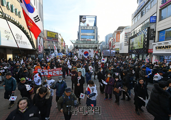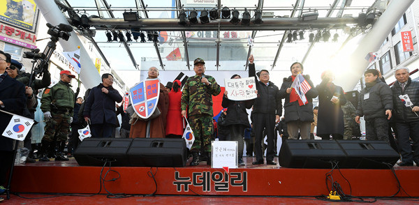 허평환 전 기무사령관을 비록한 연사들이 26일 오후 대구 동성로 대구백화점 앞에서 열린 대통령탄핵기각을위한국민총궐기운동본부(탄기국) 태극기 집회에서 만세삼창을 외치며 집회를 마무리하고 있다. 이날 대구 태극기집회에는 권영해 탄기국 공동대표, 김진태, 조원진 의원, 정미홍 전 KBS아나운서, 허평환 전 기무사령관, 박성현 뉴데일리주필 등이 연사로 나섰다. 행사를 마친 참가자들은 태극기를 흔들며 동성로 일대를 행진했다. (대구=뉴데일리 정상윤 기자)