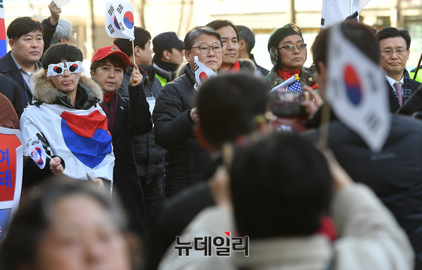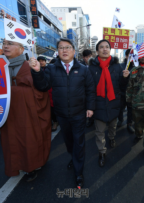 김진태, 조원진 새누리당 의원이 26일 오후 대구 동성로 대구백화점 앞에서 열린 대통령탄핵기각을위한국민총궐기운동본부(탄기국) 태극기 집회 직후 태극기를 흔들며 동성로 일대를 행진하고 있다. 이날 대구 태극기집회에는 권영해 탄기국 공동대표, 김진태, 조원진 의원, 정미홍 전 KBS아나운서, 허평환 전 기무사령관, 박성현 뉴데일리주필 등이 연사로 나섰다. 행사를 마친 참가자들은 태극기를 흔들며 동성로 일대를 행진했다. (대구=뉴데일리 정상윤 기자)