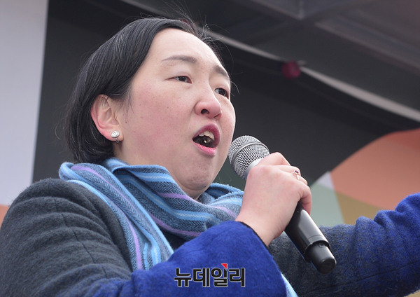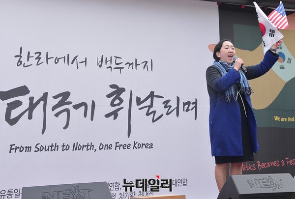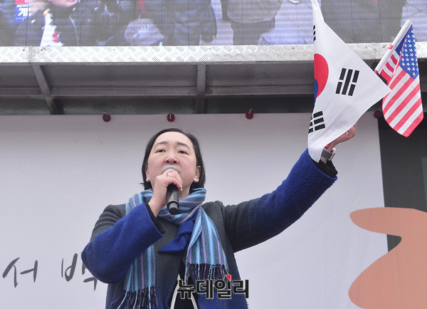인지연 자유와통일을향한변호사연대 사무총장이 28일 오후 덕수궁 앞 대한문에서 열린 태극기집회에 참석해 발언하고 있다. 인 사무총장은 대통령 풍자 누드화 전시로 논란에 휩싸인 더불어민주당 표창원 의원을 언급하며 "대한민국을 폭행한 것이고 대한민국의 국격을 훼손한 것이다. 대한민국 법치주의와 자유민주주의가 짓밟혔다. 이 지경에 이른 근본 원인은 언론의 반역 때문이다"라고 말했다.
