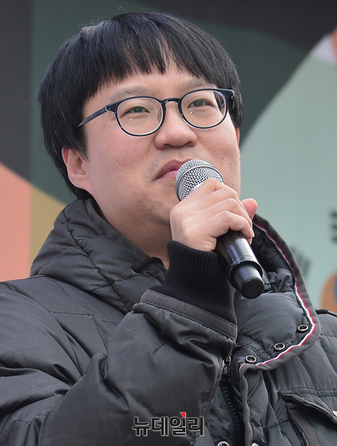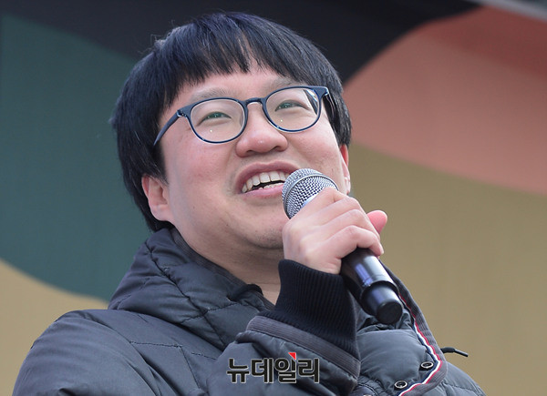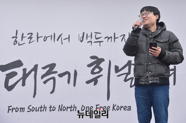 만화가 윤서인씨가 28일 오후 덕수궁 앞 대한문에서 열린 태극기집회에 참석해 발언하고 있다.
