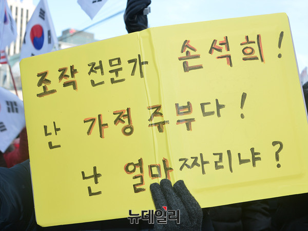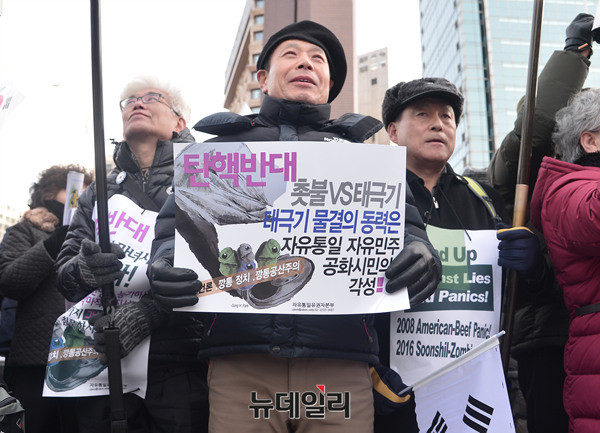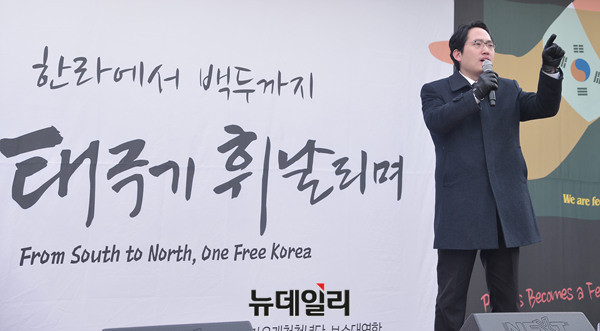 최대집 전국의사총연합 상임대표가 28일 오후 덕수궁 앞 대한문에서 열린 태극기집회에 참석해 발언하고 있다. 최 대표는 "탄핵 기각을 위해서는 'JTBC의 최순실 태블릿PC 조작 보도 의혹'에 대한 심사가 이뤄질 수 있도록 방송통신심의위원회를 압박해야 한다"고 주장했다.
