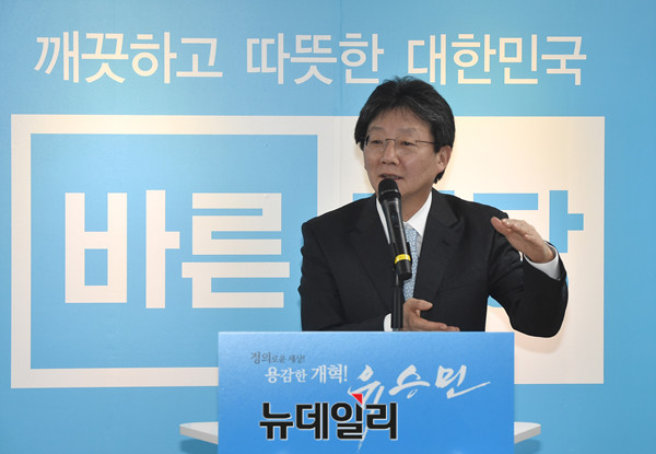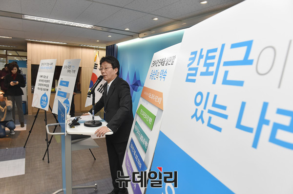 대선 출마 선언을 한 유승민 바른정당 의원이 1일 오전 서울 여의도 바른정당 당사에서 진행된 공약발표에서 칼퇴근 보장, SNS 돌발근무방지 법안 추진을 발표하고 있다.