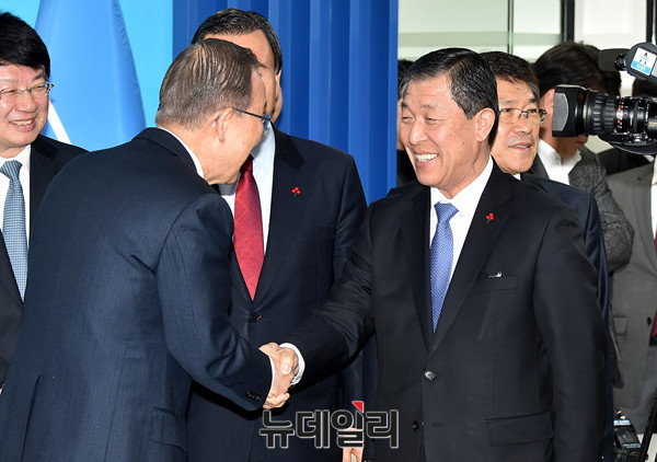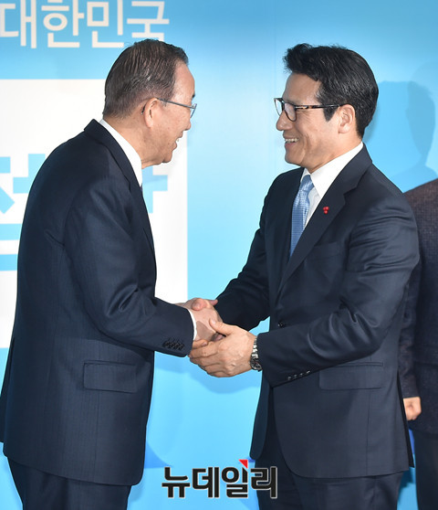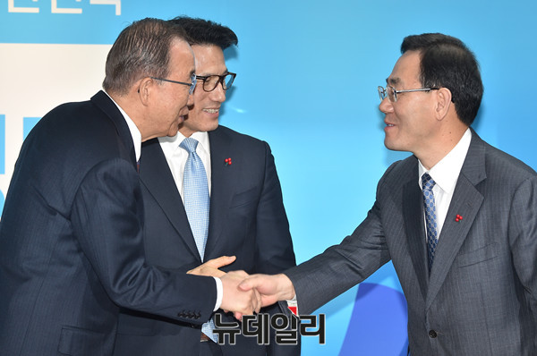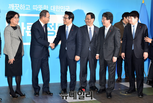 반기문 전 유엔 사무총장이 1일 오전 서울 여의도 바른정당 당사를 방문해 정병국 대표, 주호영 원내대표 등 의원들과 인사를 나누고 있다.
