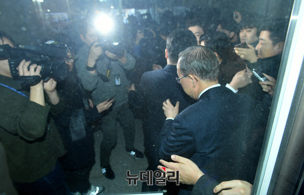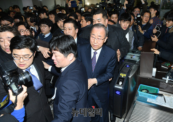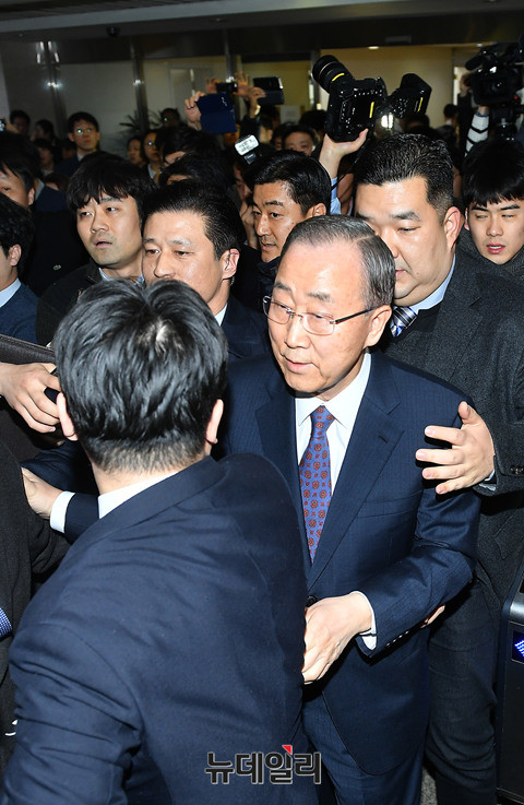 반기문 전 유엔사무총장이 1일 오후 국회 기자회견장에서 긴급 기자회견을 열고 "기성 정치권의 편협한 이기주의에 실망해 대선에 불출마 한다"고 밝힌 직후 기자회견장을 빠져나가고 있다.