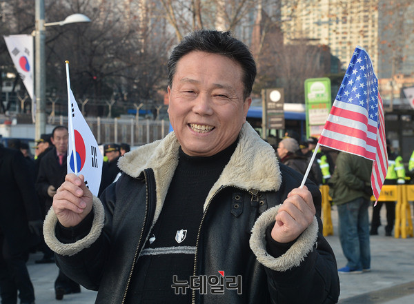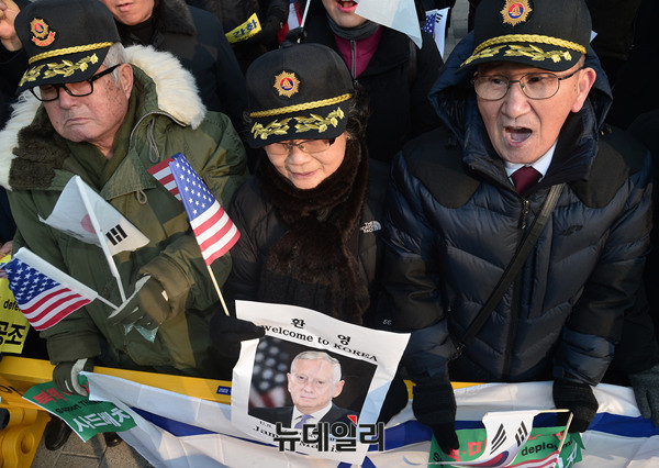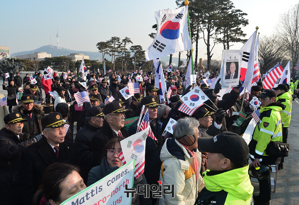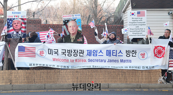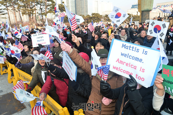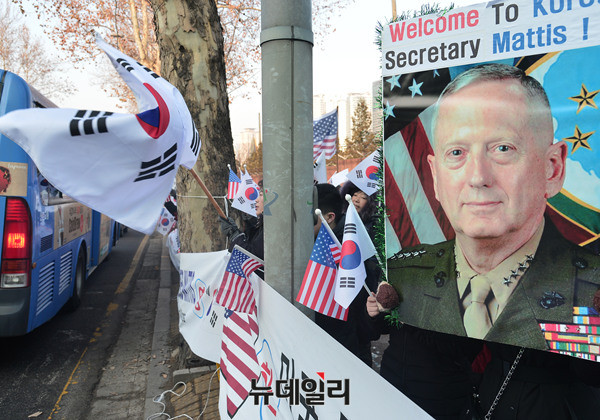 애국단체는 3일 오전 용산 전쟁기념관 앞에서 '제임스 매티스(James Norman Mattis)' 미 국방부장관 방한을 환영하는 집회를 개최했다. 이날 집회에 참석한 시민들은 태극기와 성조기를 들고 방한 한 제임스 매티스 장관을 환영했다.