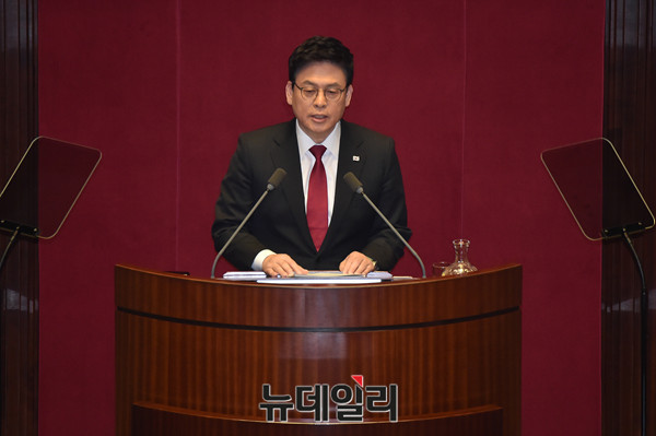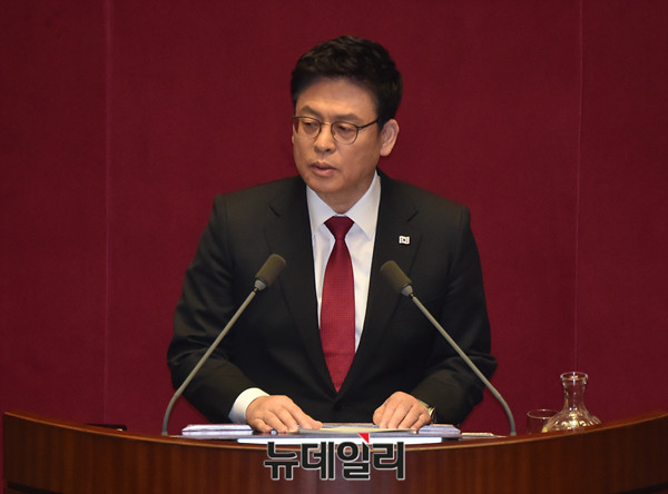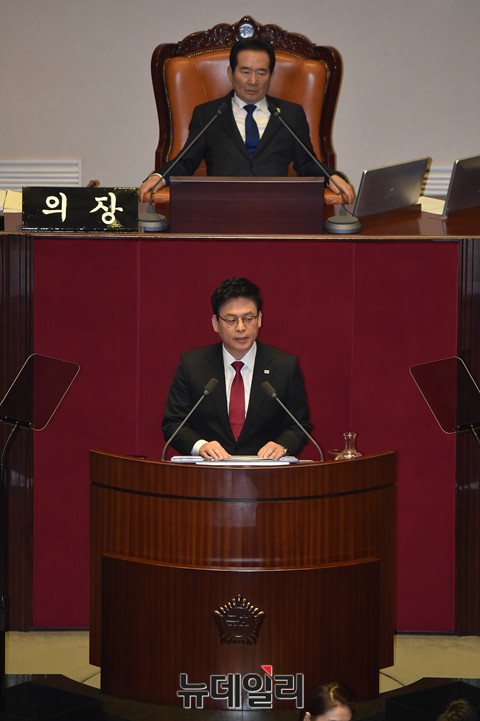새누리당 정우택 원내대표가 3일 오전 국회에서 열린 본회의에서 교섭단체 대표연설을 하고 있다.
