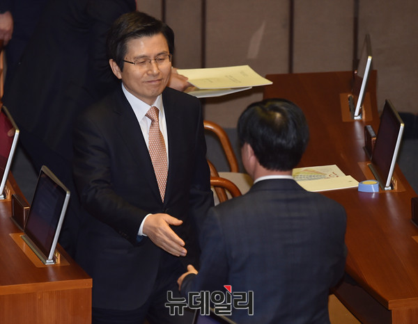 황교안 대통령 권한대행이 3일 오전 국회에서 열린 본회의에 참석해 바른정당 하태경 의원과 인사를 나누고 있다.
