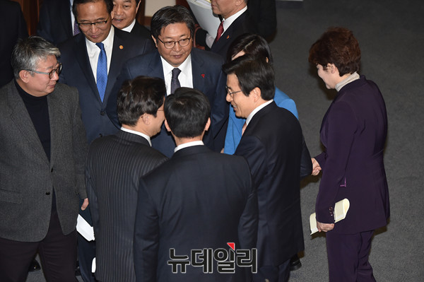 [포토] 더불어민주당 의원들과 인사 나누는 황교안 권한대행