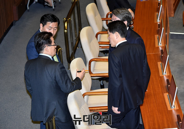 국민의당 박지원 대표, 주승용 원내대표, 안철수 전 상임공동대표 등 의원들이 3일 오전 국회 본회의장에서 열린 새누리당 교섭단체 대표연설 중 대화를 나누고 있다.