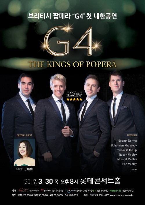 팝페라 그룹 G4의 첫 내한공연은 롯데콘서트홀, 인터파크, 티켓링크, 예스24에서 예매할 수 있다. 티켓 가격은 4만~12만원이다.