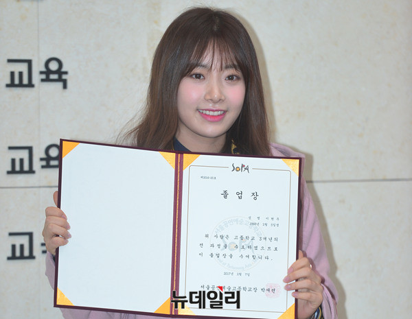배우 현주가 7일 오전 서울 구로구 서울공연예술고등학교에서 열린 졸업식에 참석해 포토타임을 갖고 있다.