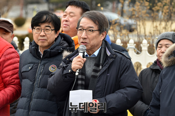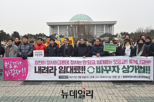 정운찬 전 국무총리가 8일 오후 국회 정문앞에서 열린 "내려라 임대료!! 바꾸자 상가법!!" 기자회견에 참석해 발언을 하고 있다.