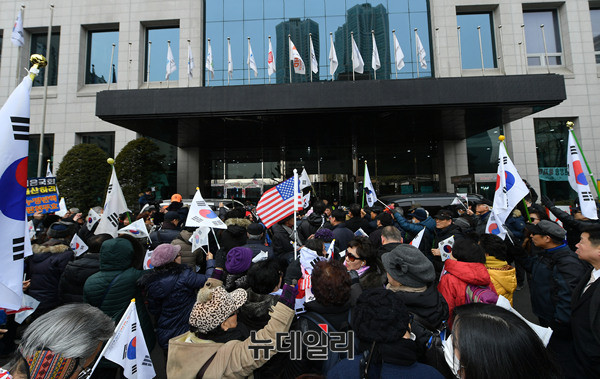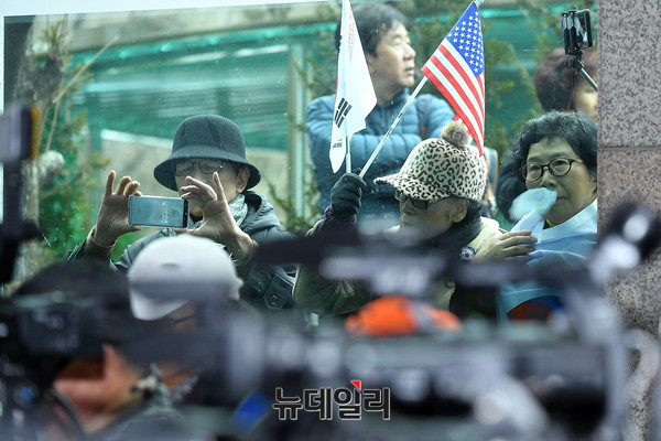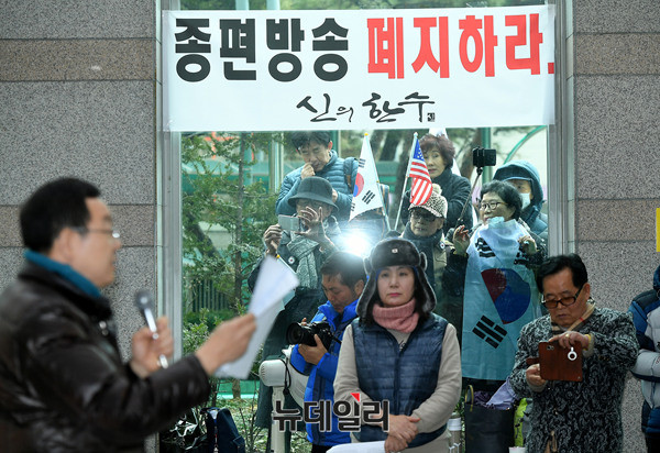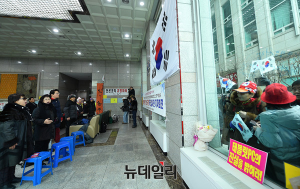 태블릿PC 진실규명을 요구하며 한국방송회관 로비를 23일 째 점거농성해 오던 9명의 애국시민들이 8일 오후 한국방송통신심의위원회가 위치한 서울 양천구 한국방송회관 로비에서 기자회견을 진행하는 동안 건물안으로 들어오지 못한 시민들이 유리창 건너로 기자회견을 지켜보고 있다.