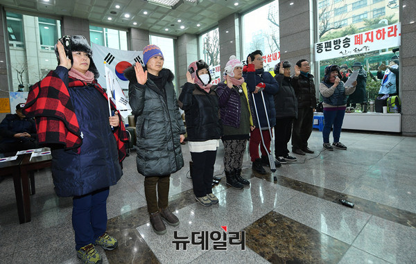 태블릿PC 진상규명을 요구하며 한국방송회관 로비에서 23일째 농성을 이어가던 9인이 8일 오후 서울 양천구 한국방송회관 로비에서 열린 태블릿PC 진실규명을 위한 방심위 9인 결사대 기자회견에서 국민 감시단을 발족하며 선서를 하고 있다.