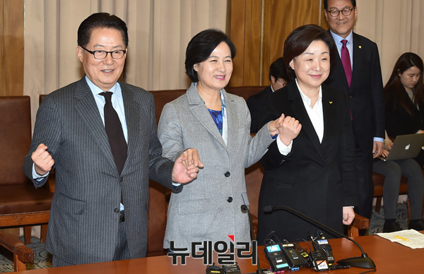 국민의당 박지원 대표, 더불어민주당 추미애 대표, 정의당 심상정 대표가 8일 국회에서 열린 야3당 대표 회동에 참석해 취재진에 포즈를 취하고 있다.