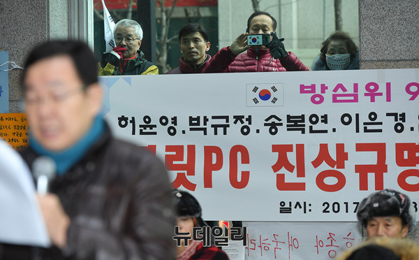 허윤영 최후의 9인 대변인이 8일 오후 서울 양천구 한국방송회관 로비에서 열린 태블릿PC 진실규명을 위한 방심위 9인 결사대 기자회견에서 회견문을 발표하고 있다.