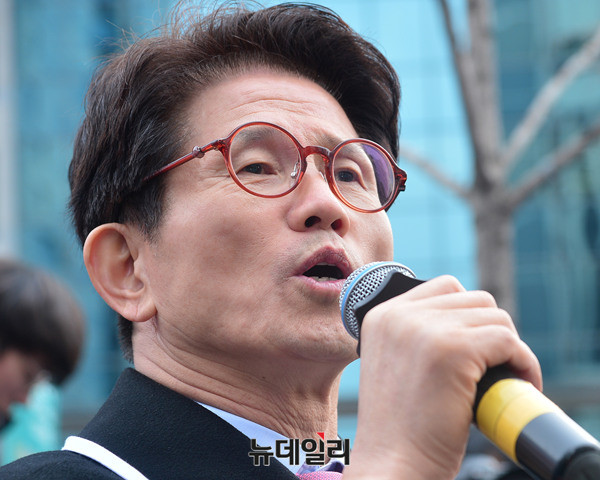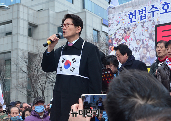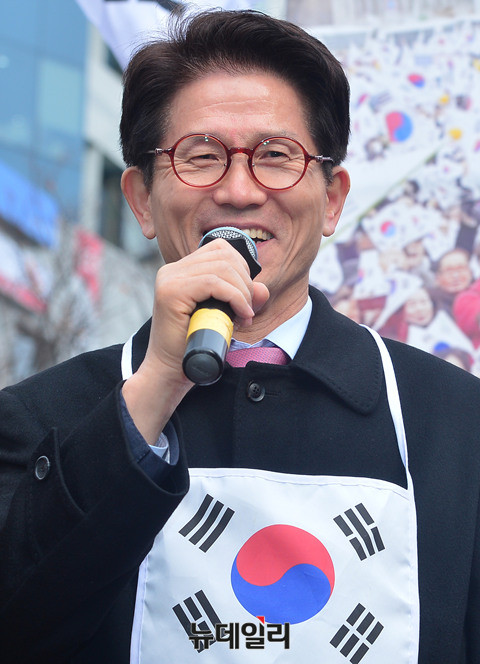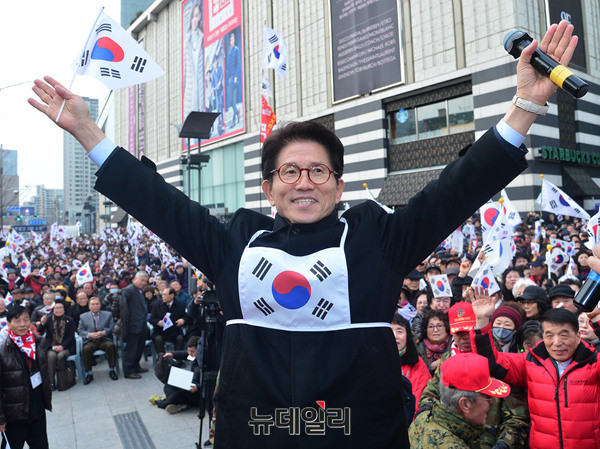 김문수 새누리당 비상대책위원이 8일 오후 대구 중구 동아백화점 앞 광장에서 열린 '탄핵기각을위한국민운동 대구시민총궐기집회'에서 만세를 외치고 있다.