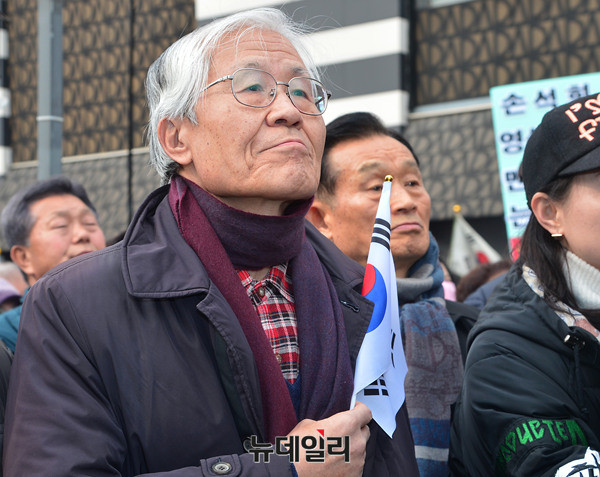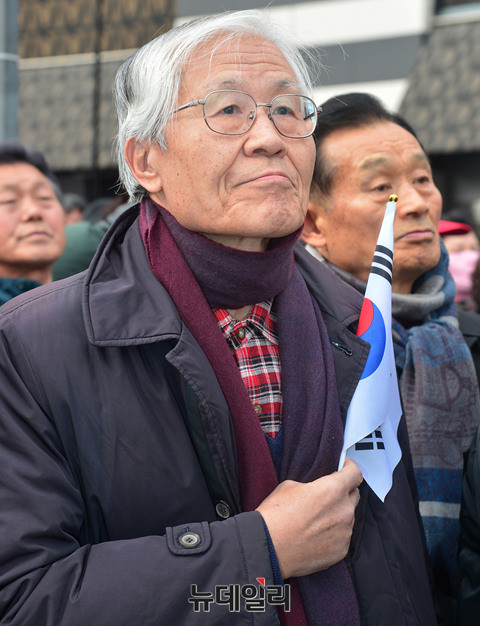 조갑제 조갑제닷컴대표가 8일 오후 대구 중구 동아백화점 앞 광장에서 열린 '탄핵기각을위한국민운동 대구시민총궐기집회'에서 국민의례를 하고 있다.