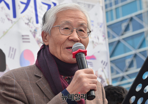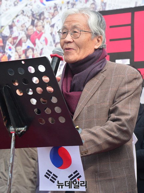 조갑제 조갑제닷컴대표가 8일 오후 대구 중구 동아백화점 앞 광장에서 열린 '탄핵기각을위한국민운동 대구시민총궐기집회'에서 연설을 하고 있다.