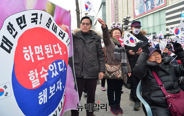자유민주주의수호시민연대와 새로운한국을위한국민운동은 8일 오후 대구 중구 동아백화점 앞 광장에서 열린 '탄핵기각을위한국민운동 대구시민총궐기집회'를 개최했다. 한 집회 참가자가 '대한민국 힘내라 하면된다·할수있다·해보자'라고 적힌 현수막을 들고 구호를 외치고 있다.