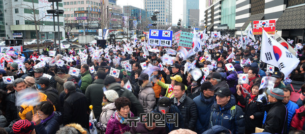 행사를 마친 참가자들은 태극기를 흔들며 동아백화점에서 중부소방서까지 약 1.7km를 행진했다. (대구=뉴데일리 공준표 기자)
