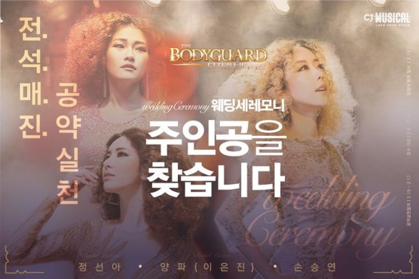 정선아-양파-손승연이 특별한 웨딩 세레모니를 펼친다.뮤지컬 '보디가드'에서 레이첼 마론 역으로 열연 중인 정선아-양파-손승연은 오는 15일부터 17일까지 직접 축가를 불러주는 매진 공약을 이행한다.'레이첼 마론들의 매진 공약'은 2월 15일(양파), 16일(정선아), 17일(손승연) 3일 동안 진행된다. 사전 신청한 관객들 중 매일 1쌍을 선정해 무대 위 배우들의 축하 속 스페셜 행진이 준비돼 있다.부모님께 리마인드 웨딩을 선물하고 싶거나, 사정으로 인해 결혼식을 치르지 못한 커플, 결혼을 앞두고 있는 예비부부의 깜짝 프러포즈 등 특별한 축가를 받고 싶은 사연을 작성해서 신청하면 된다.사연 응모는 CJ Musical 공식 페이스북, 또는 CJ Musical 대표 이메일(cjenmmusical@naver.com)로 접수 가능하다. 사연은 2월 9일부터 12일까지 4일 동안 접수를 받는다.지난해 11월 '보디가드'의 주연 배우들은 제작발표회에서 매진 공약을 내세웠고, '레이첼 마론' 역의 세 여배우는 결혼식 축가를 하겠다고 밝혔다. 앞서 '프랭크 파머' 역을 맡은 이종혁과 박성웅은 각각 12월과 1월, 관객들과 함께하는 이색 공약을 실천한 바 있다.故 휘트니 휴스턴의 주옥 같은 넘버 16곡이 담긴 뮤지컬 '보디가드'는 3월 5일까지 LG아트센터에서 공연된다.[사진=CJ E&M]