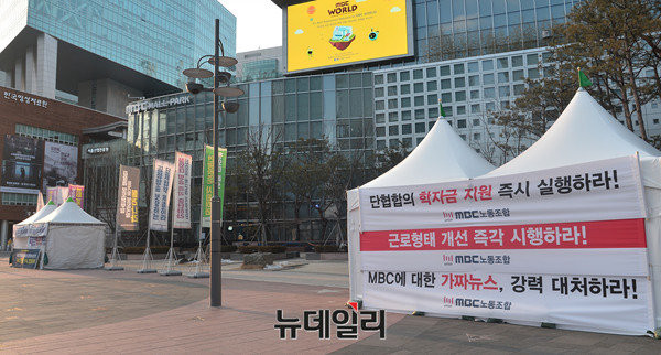 MBC 신임 사장 선임을 목전에 두고 사내 기류가 요동치고 있다. 민주노총 산하 전국 언론노조 문화방송본부(1노조 / 신임본부장 김연국) 소속 조합원들이 사옥 안팎으로 천막 농성과 손피켓 시위를 벌이며 "경영진 사퇴" "사장선임 중단" 등을 부르짖자, 상대적으로 온건파인 MBC노동조합(3노조 / 공동위원장 김세의·임정환·최대현)도 1노조 바로 옆에 농성 천막을 치고 "단협합의 학자금 지원을 즉시 실행하라"며 1노조에 맞불을 놓는 양상을 보이고 있는 것.