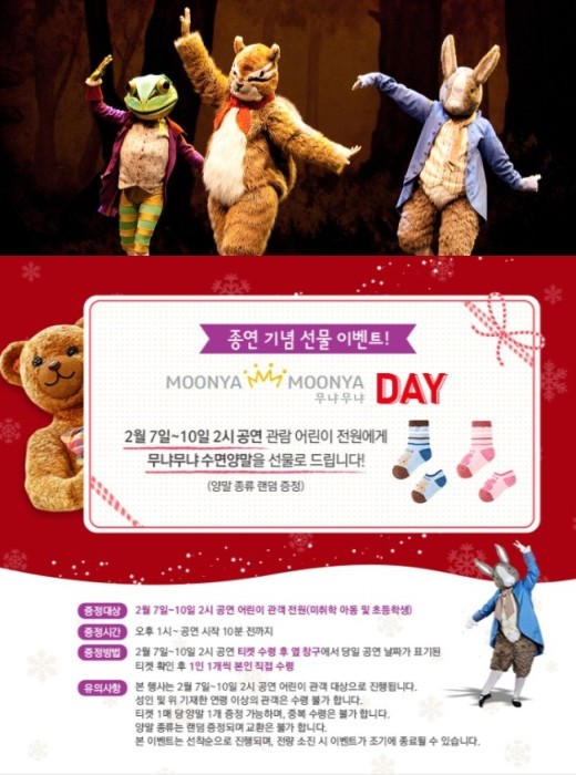 인형발레 '백조의 호수'가 2월 12일 종연을 앞두고 굿바이 이벤트를 선보인다.먼저 오는 10일까지 오후 2시 공연을 찾아오는 어린이 관객 전원에게 무냐무냐 수면양말을 선물로 증정한다.또 예매처 인터파크, 예스24에서 10일까지 예매 시 50%, BC 국민행복카드, BC 아이행복카드로 결제 시 55%의 혜택을 제공하는 굿바이 타임세일을 마련했다.국내 최초의 인형발레극 '백조의 호수'는 차이콥스키의 클래식 발레 '백조의 호수'를 친근한 숲 속 동물의 세계로 그려낸 작품으로 전문 무용수들이 동물의상을 입고 환상적인 무대를 연출한다.2013년 초연 이후 폭발적인 입소문에 힘입어 5년 연속 매진 행렬을 기록하고 있으며, 예스24 관객 평점 9.8, 인터파크 9.4, 네이버 9점 등 높은 평점과 함께 호평이 이어지고 있다.인형발레 '백조의 호수'는 2월 12일까지 올림픽공원 우리금융아트홀에서 공연된다.