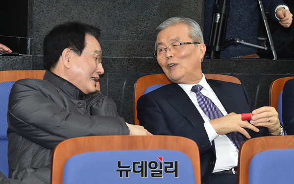 김종인 더불어민주당 의원이 9일 오전 국회에서 열린 의원총회에 참석해 변재일 의원과 대화를 나누고 있다.