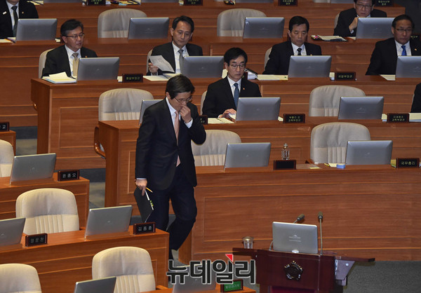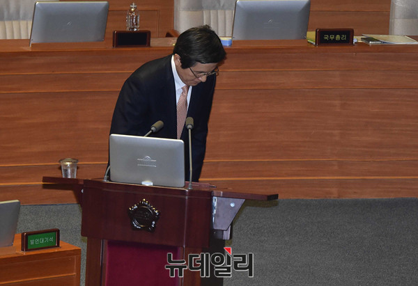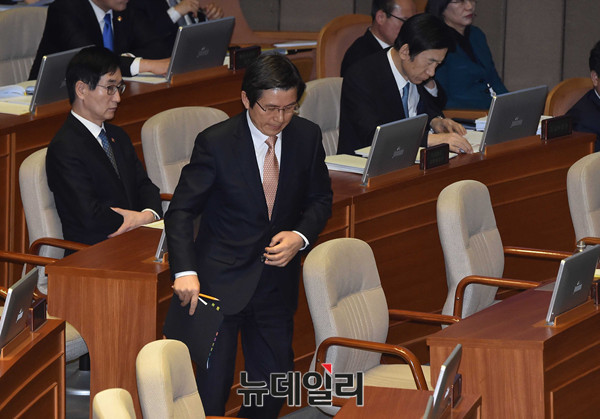 황교안 대통령권한대행이 10일 오후 국회에서 열린 대정부질문 비경제분야에 출석해 의원들의 질문에 답하기 위해 단상으로 향하고 있다.