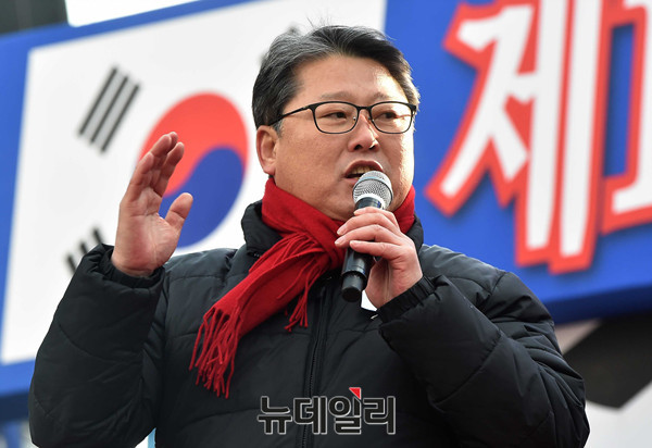 새누리당 조원진 의원이 11일 오후 서울 중구 덕수궁 대한문 앞에서 열린 '탄핵기각을 위한 국민총궐기 운동본부(탄기국)' 주최로 열린 태극기 집회에 참석해 발언을 하고 있다.