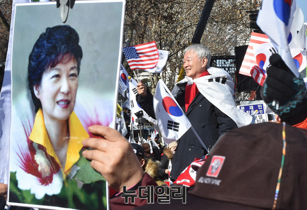 대통령 변호인단 서석구 변호사가 11일 오후 서울 중구 덕수궁 대한문 앞에서 열린 '탄핵기각을 위한 국민총궐기 운동본부(탄기국)' 주최 태극기 집회에 참석해 태극기를 흔들고 있다.