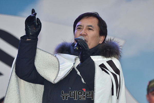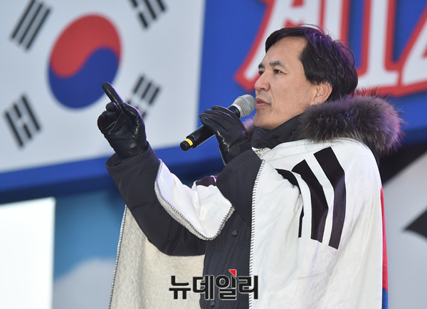 새누리당 김진태 의원이 11일 오후 서울 중구 덕수궁 대한문 앞에서 열린 '탄핵기각을위한국민총궐기운동본부(탄기국)' 주최 제 12차 태극기 집회에 참석해 발언을 하고 있다.