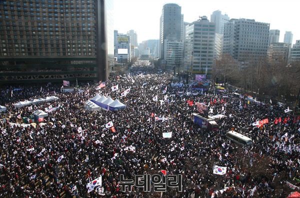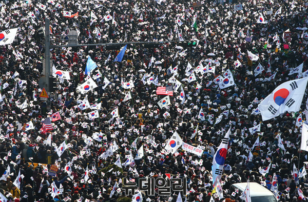 11일 오후 서울 중구 덕수궁 대한문 앞에서 '대통령탄핵기각을위한국민총궐기운동본부(탄기국)' 주최로 제 12차 태극기 집회가 열린 가운데 수만 명의 사람들이 태극기를 들고 대한문, 서울광장을 가득 메우고 있다.