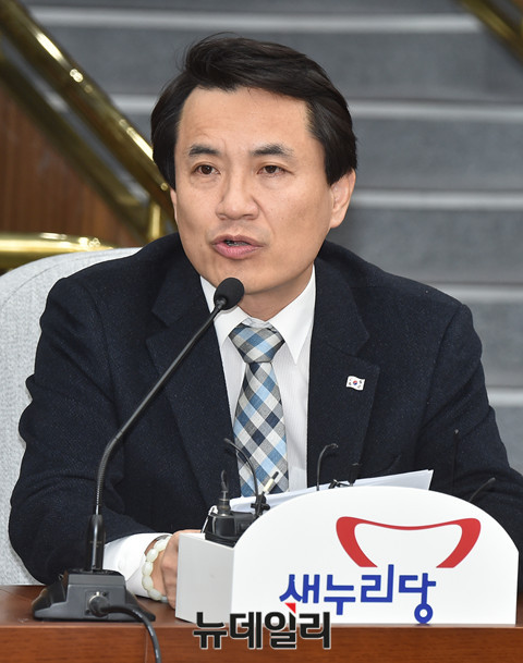 새누리당 김진태 의원이 13일 오전 국회에서 열린 원내대책회의에서 고영태 범죄 협의를 열거하며 구속수사를 촉구하고 있다.