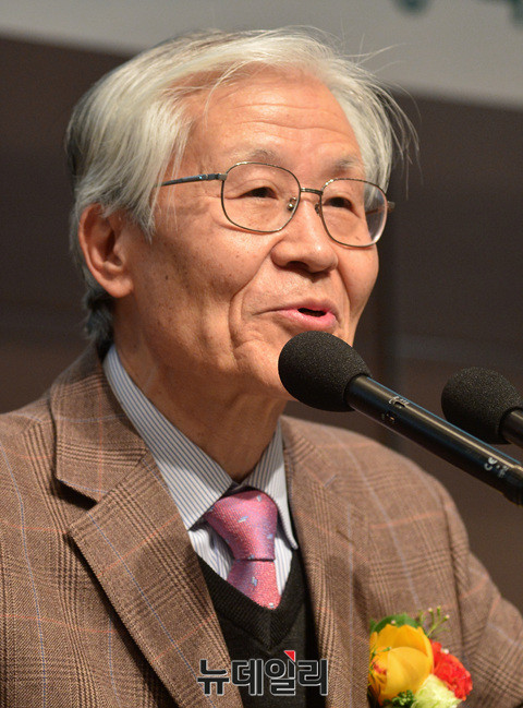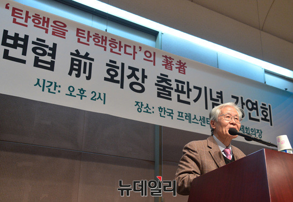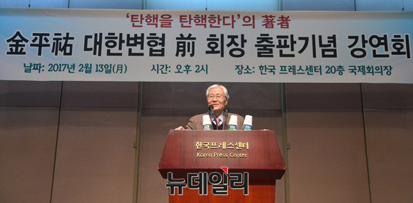 조갑제 조갑제닷컴대표가 13일 오후 프레스센터에서 열린 김평우 전 대한변호사협회장의 저서 '탄핵을 탄핵한다' 출판기념 강연회에 참석해 서평하고 있다.