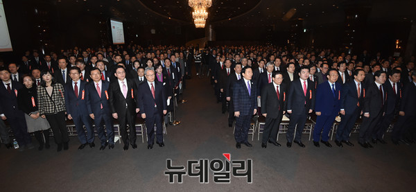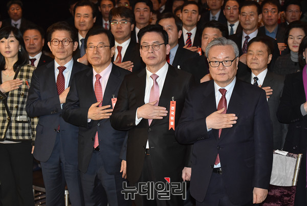 인명진 자유한국당 비상대책위원장, 정우택 원내대표 등 참석자들이 13일 오후 서울 여의도 타임스퀘어에서 열린 전국위원회에서 국민의례를 하고 있다.