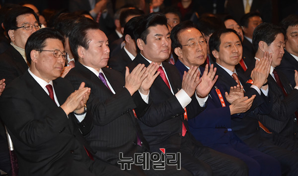 인명진 자유한국당 비상대책위원장, 정우택 원내대표 등 참석자들이 13일 오후 서울 여의도 타임스퀘어에서 열린 전국위원회에서 자유한국당 로고와 당명이 통과하자 박수를 치고 있다.