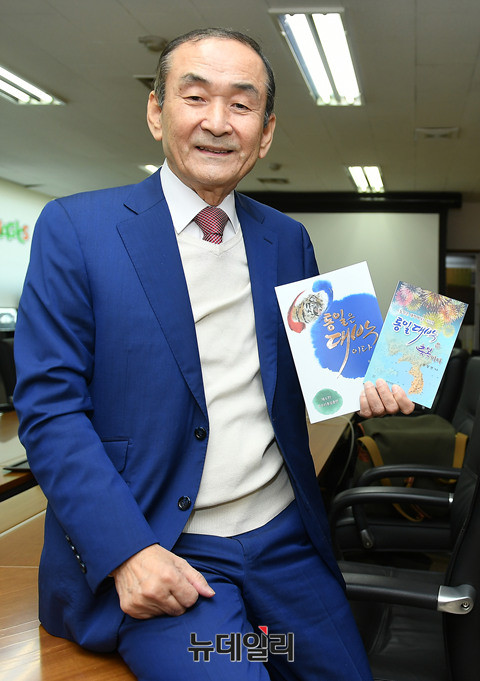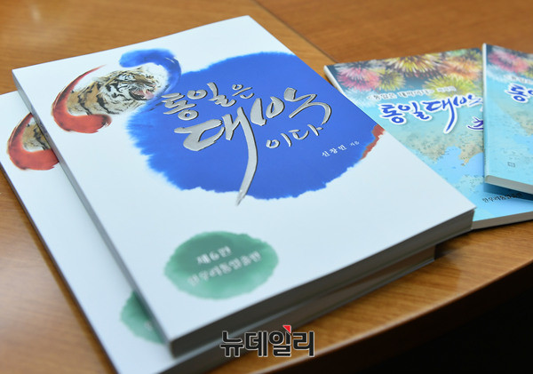 신창민 통일대박정책연구원장이 14일 오전 서울 서초구에 위치한 한 사무실에서 2012년에 출간된 책 '통일은 대박이다'와 요약본 '통일대박은 축복이다'를 들고 있다.