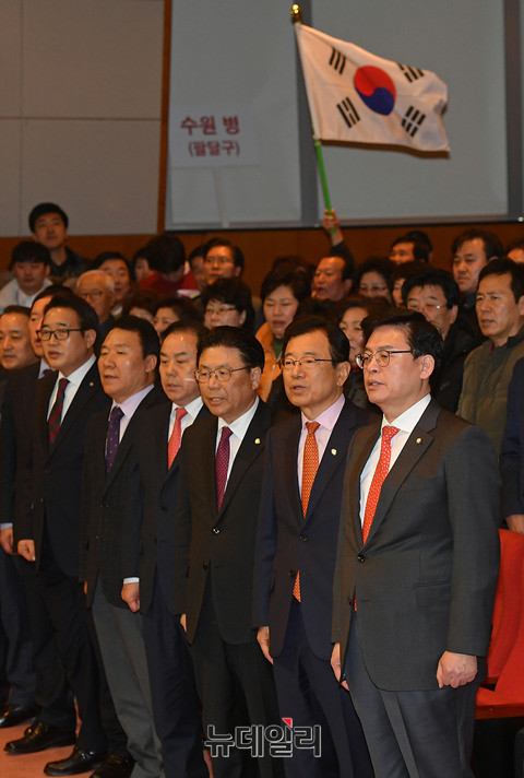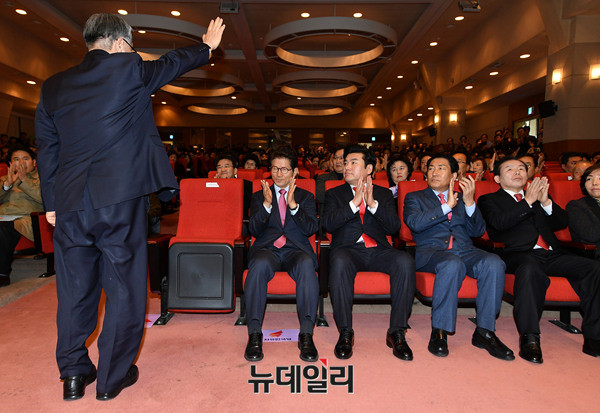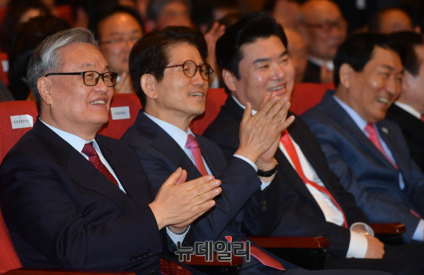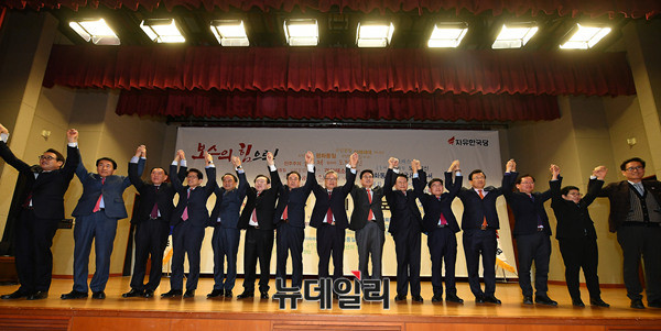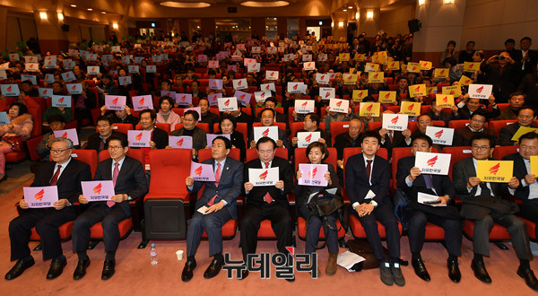 인명진 자유한국당 비상대책위원장, 김문수 비상대책위원, 원유철 전 원내대표, 안상수 의원, 이인제 전 최고위원 등 지도부가 14일 오후 수원 권선구 경기종합노동복지회관 대강당에서 열린 자유한국당 '보수의 힘으로! 경기 당원과 함께' 당원연수에서 참석해 포토타임을 갖고 있다. (경기 수원=뉴데일리 정상윤 기자)