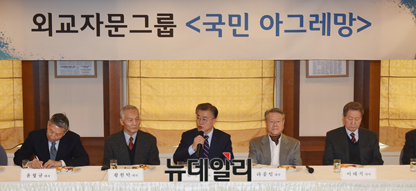 대선출마를 선언한 문재인 전 더불어민주당 대표가 16일 오전 서울 중구 한국프레스센터에서 열린 외교자문그룹인 '국민아그레망' 좌담회에 참석해 모두발언을 하고 있다.
