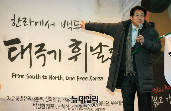 조영환 올인코리아 대표가 16일 오후 방송통신심의위원회가 위치한 서울 양천구 한국방송회관 앞에서 언론폭동 진압대회를 열고, 목동 SBS 사옥으로 장소를 옮겨 발언을 하고 있다.