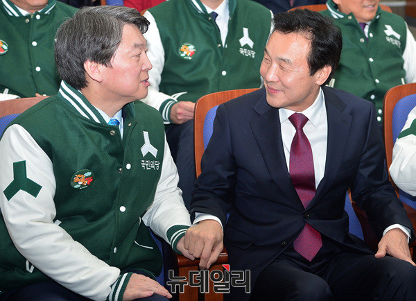 안철수 국민의당 전 공동상임대표와 손학규 국민주권개혁회의장이 17일 오전 국회에서 열린 국민의당 입당식에 참석해 대화를 나누고 있다.