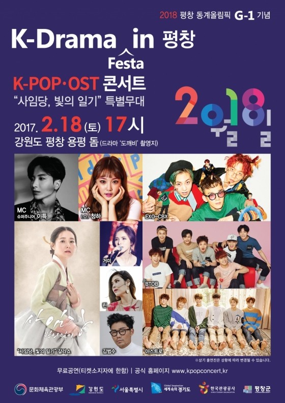 서울시가 경기도·강원도(이하 ‘3개 시·도’)와 함께 2018 평창 동계올림픽 공동 관광마케팅의 첫 번째 사업으로 오는 18일 강원도 평창에서 'K-Drama Festa in 평창'을 개최한다고 17일 밝혔다.'K-Drama Festa in 평창'은 평창 동계올림픽 1년을 앞두고 열리는 기념 행사 중 하나로, 평창 동계올림픽의 국민적 관심을 높이고 3개 시·도가 문화체육관광부·한국관광공사와 공동으로 올림픽이라는 국제적 스포츠 이벤트를 계기로 해외 관광객을 유치하기 위해 마련됐다.이 행사는 외국에게 인기를 끈 한류 드라마의 OST와 K-POP콘서트, 드라마 ‘사임당 빛의 일기’와 함께하는 한복 패션쇼로 꾸며지며, 다양한 먹거리와 체험행사 등 부대행사도 진행된다.콘서트에는 K-POP스타 EXO(C.B.X), 비투비(BTOB), ‘태양의 후예’ OST 가수로 유명한 린, 거미, 김범수 등이 출연한다. 행사에는 외국인 관광객 3천 명을 포함해 약 5천 명이 관람할 예정이다.공연실황은 평창 동계올림픽 해외 홍보를 위해 TV특집 프로그램으로 녹화 후 세계 188개국에 방영된다.서울시 김명주 관광사업과장은 “지자체들이 힘을 합쳐 평창올림픽이 성공적으로 개최되고, 서울-지방 간 상생관계가 구축되도록 전력을 다할 것”이라며 “3개 시․도 공동마케팅의 효과를 더욱 높이기 위해 중앙정부와도 필요한 부분은 협업해 나갈 예정”이라고 말했다.