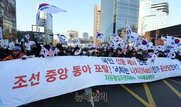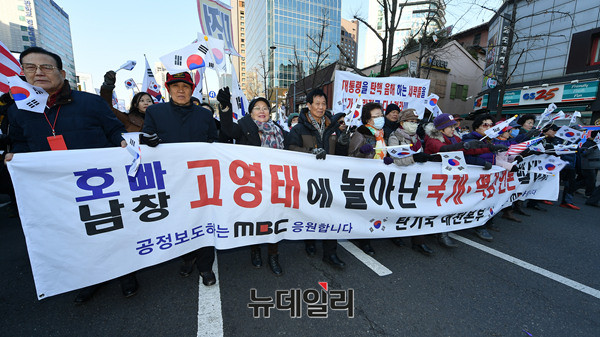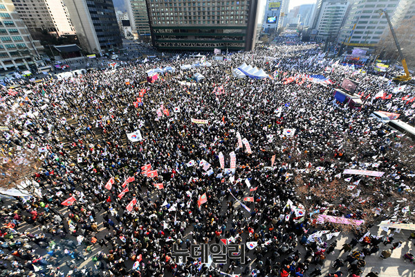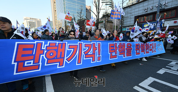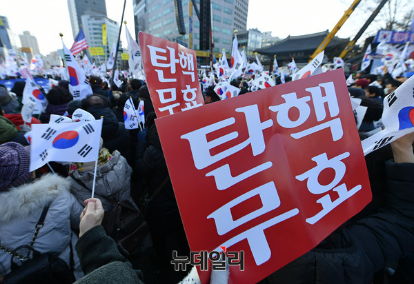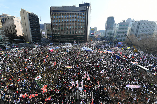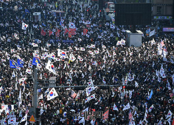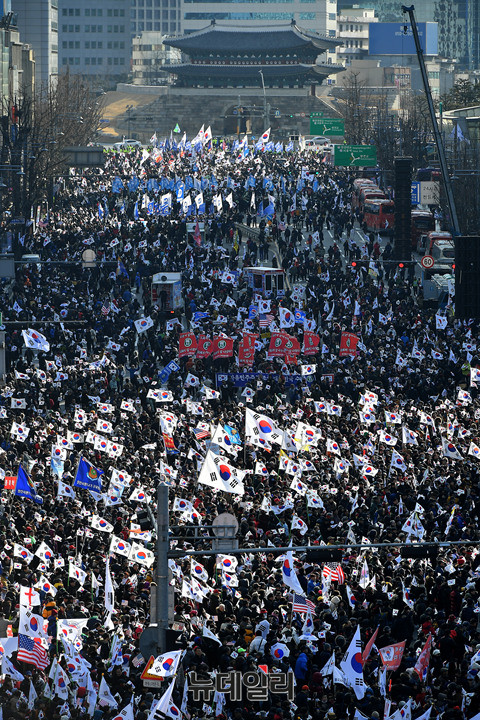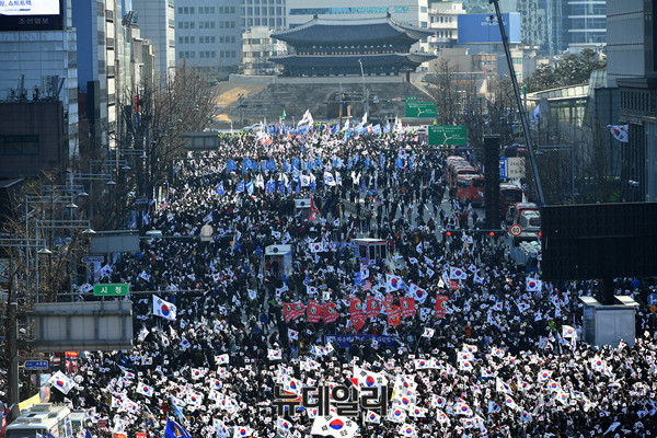 대통령탄핵기각을위한국민총궐기운동본부(탄기국)가 18일 오후 2시부터 서울광장에서 13차 태극기 집회를 개최 했다. 참가자들은 태극기와 성조기를 들고 서울광장에서 남대문까지 가득 메웠다. 이들은 1차 집회를 마무리하고 가두행진을 한 뒤 2차 집회를 이어가고 있다.