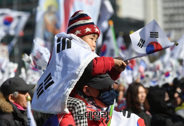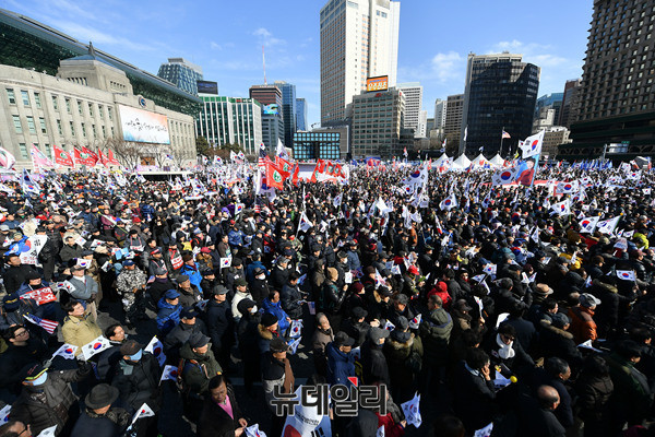 대통령탄핵기각을위한국민총궐기운동본부(탄기국)가 18일 오후 2시부터 서울광장에서 13차 태극기 집회를 개최 했다. 태평로에서 서울광장, 남대문 앞까지 가득 메운 참가자들은 태극기와 성조기를 들고 '탁핵 무효' '특검 해체' '고영태에 놀아난 언론 국개(국회) 규탄' '조선 중앙 동아 포털, 너희는 나치냐? 공상당이냐?' '계엄이 답이다' '국회가 버린 대통령 국민이 살리자' 등등 갖가지 구호를 흔들고 외치며 대회를 마친뒤 남대문과 한국은행을 도는 시가행진을 벌였다.