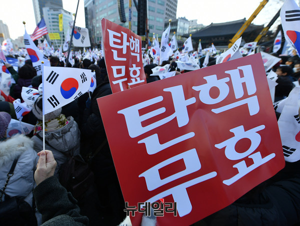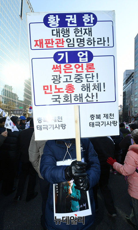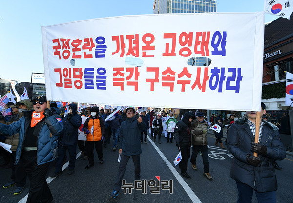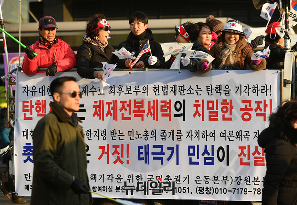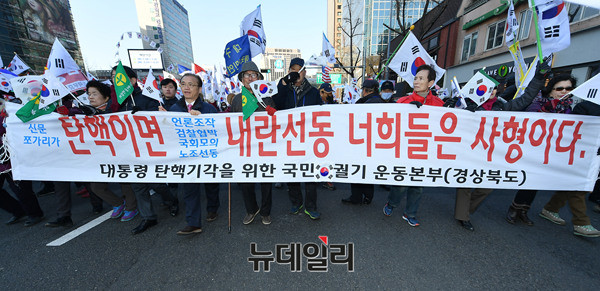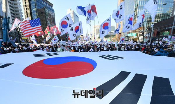 제13차 태극기집회 참가자들이 18일 오후 서울광장에서 열린 대통령탄핵기각을위한국민총궐기운동본부(탄기국) 태극기 집회 1부행사를 마친 직후 가두행진을 하고 있다.