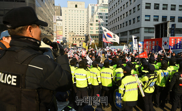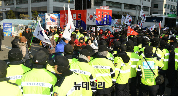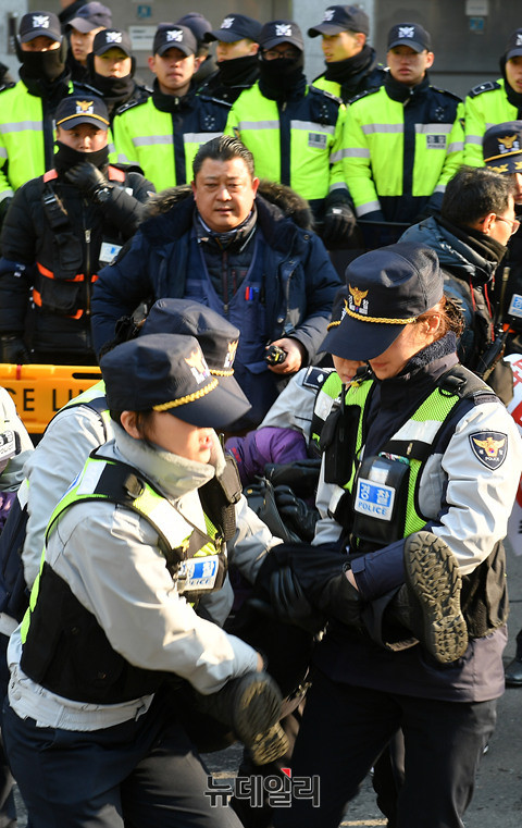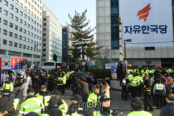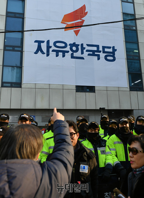 인명진 자유한국당 비상대책위원장 규탄 집회가 20일 오후 서울 여의도 자유한국당사 앞에서 진행된 가운데 경찰이 당사 앞 도로를 막아서고 있다. 이날 집회 참석자들은 "김일성을 상징하는 자유한국당의 횃불로고 변경과 인명진 비대위원장 즉각 사퇴"를 요구 했다. 일부 참가자들은 당사 벽면에 걸린 자유한국당 대형 현수막에 계란을 던지며 항의하기도 했다. 경찰은 경찰버스 위에서 그물망을 설치하고 상황을 대비했다.