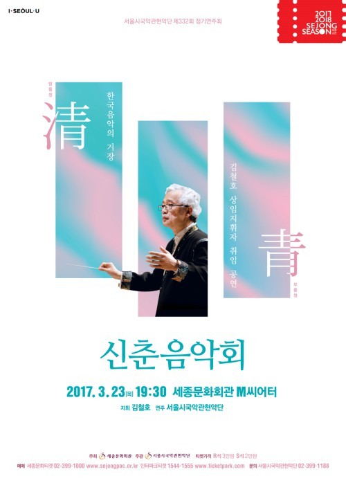김철호 서울시국악관한역단 단장의 취임 공연이 열린다.서울시국악관현악단의 2017년 첫 번째 정기연주회 '신춘음악회'가 3월 23일 오후 7시 30분 세종문화회관 M씨어터에서 개최된다.이번 '신춘음악회'는 김철호 지휘자와 한국 최초의 국악관현악단인 서울시국악관현악단의 첫 만남이다. 온고이지신(溫故而知新)의 자세로 한국 국악관현악의 역사와 함께한 의미 있는 다섯 곡의 명곡들로 꾸며진다.서울시국악관현악단의 대표 작품인 '합주곡 1번'과 '송춘곡'을 통해 초기 국악관현악의 역사를 재조명한다. 이어 '꿈의 바다'를 거쳐 현재까지의 우리 역사를 아우르는 '청청(淸靑)'과 '한강'을 선보일 예정이다.김철호 지휘자는 70년대부터 국악관현악의 역사와 함께한 인물로, 국내 유수 국악단체의 발전에 기여했으며 일본, 유럽, 미주를 비롯한 해외에서도 국악관현악 연주로 호평을 받았다.서울시국악현악단의 신춘음악회는 오는 28일까지 30% 할인가로 예매 가능하다. 연간 6개의 서울시국악관현악단의 정기연주회를 5만원에 감상할 수 있는 패키지도 3월 21일까지 세종문화회관 홈페이지에서 구입할 수 있다.